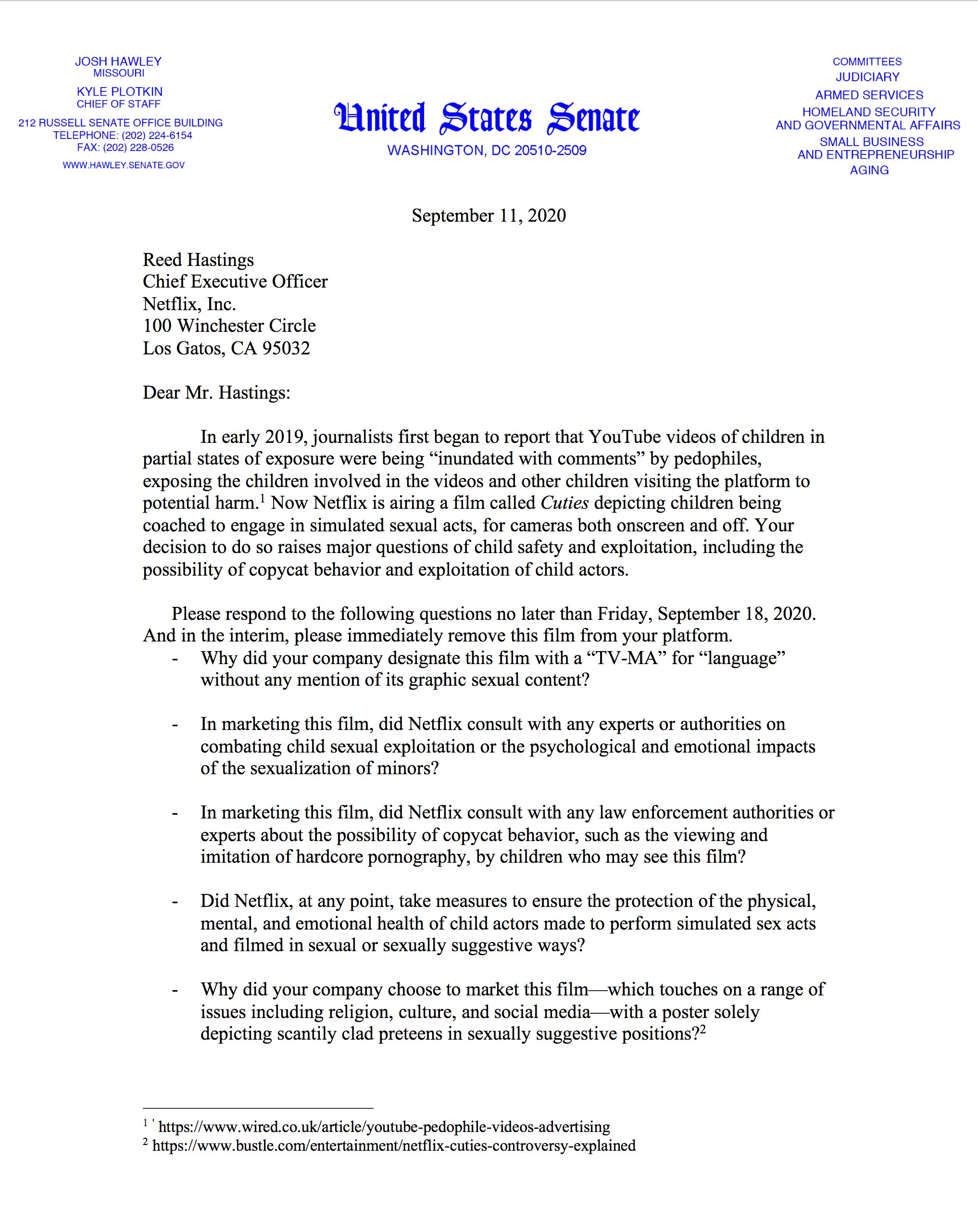 Senator Hawley Press Office On Twitter New U S Senator Josh Hawley Has Sent A Letter To Netflix Calling For The Immediate Removal Of Cuties A New Film That Depicts Preteens Engaged